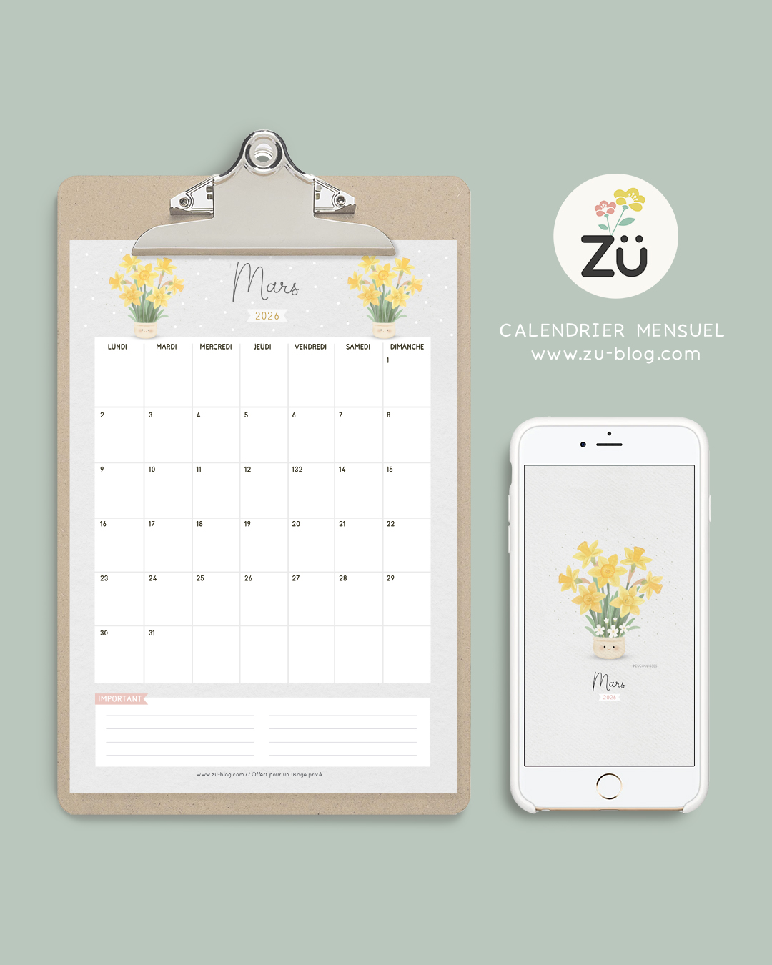 Voici le calendrier du mois de mars et ses jonquilles toutes fraiches !