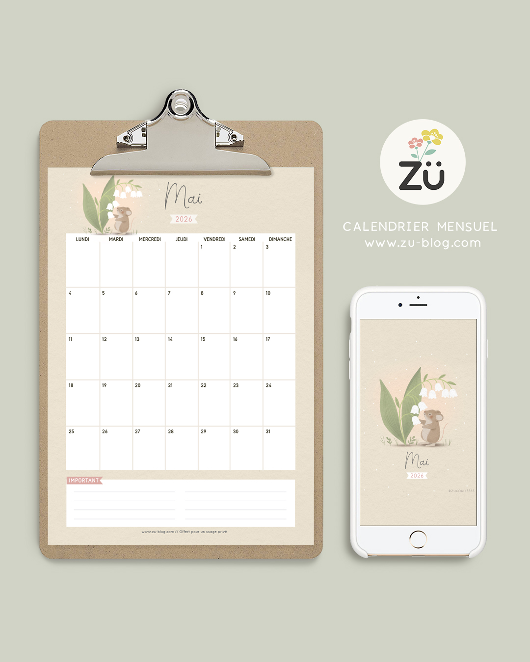 Voici le calendrier du mois de mai ! J’en profite pour vous souhaiter le meilleur avec ce petit brun de muguet ♡